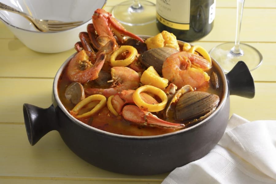 cette nourriture il s'appelle Boullabaisse, il est plus moderne que cette version clasique, Il y se preparer avec bouillon de poisson enrichi, accompagné de moules, palourdes, calmars et filets de sébaste, le nouvelle version est plus élégant J'adorais. Au fait, Le restaurant a une étoile Michelin
